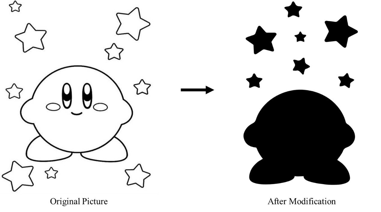 Since I am not a professional designer, I chose my favorite character, Kirby, from Google and converted the image into an .svg file that can be recognized by Autodesk Fusion 360. This conversion was performed using the open-source software Inkscape. To prepare the geometry for machining, I filled all enclosed regions that I intended to extrude. Due to tooling limitations (no end mill smaller than 1/8 inch diameter was available at the time), I simplified the geometry by removing fine details, particularly those on Kirby’s face.